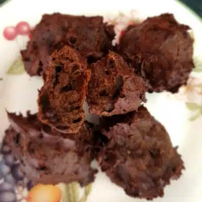 This produces a firm, very chocolatey bake that is more towards dry than moist, and you can try using slightly more or less protein powder and adding slightly more grated chocolate if you prefer, or fetch them out of the oven after 10 minutes for them to be slightly softer.