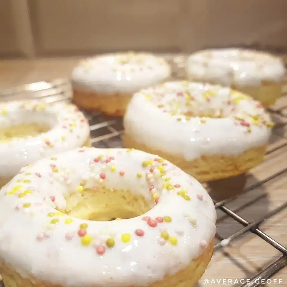 Once they're cooled completely, mix the quark, honey and just a splash of milk to make a thick icing you can dip the doughnuts in.